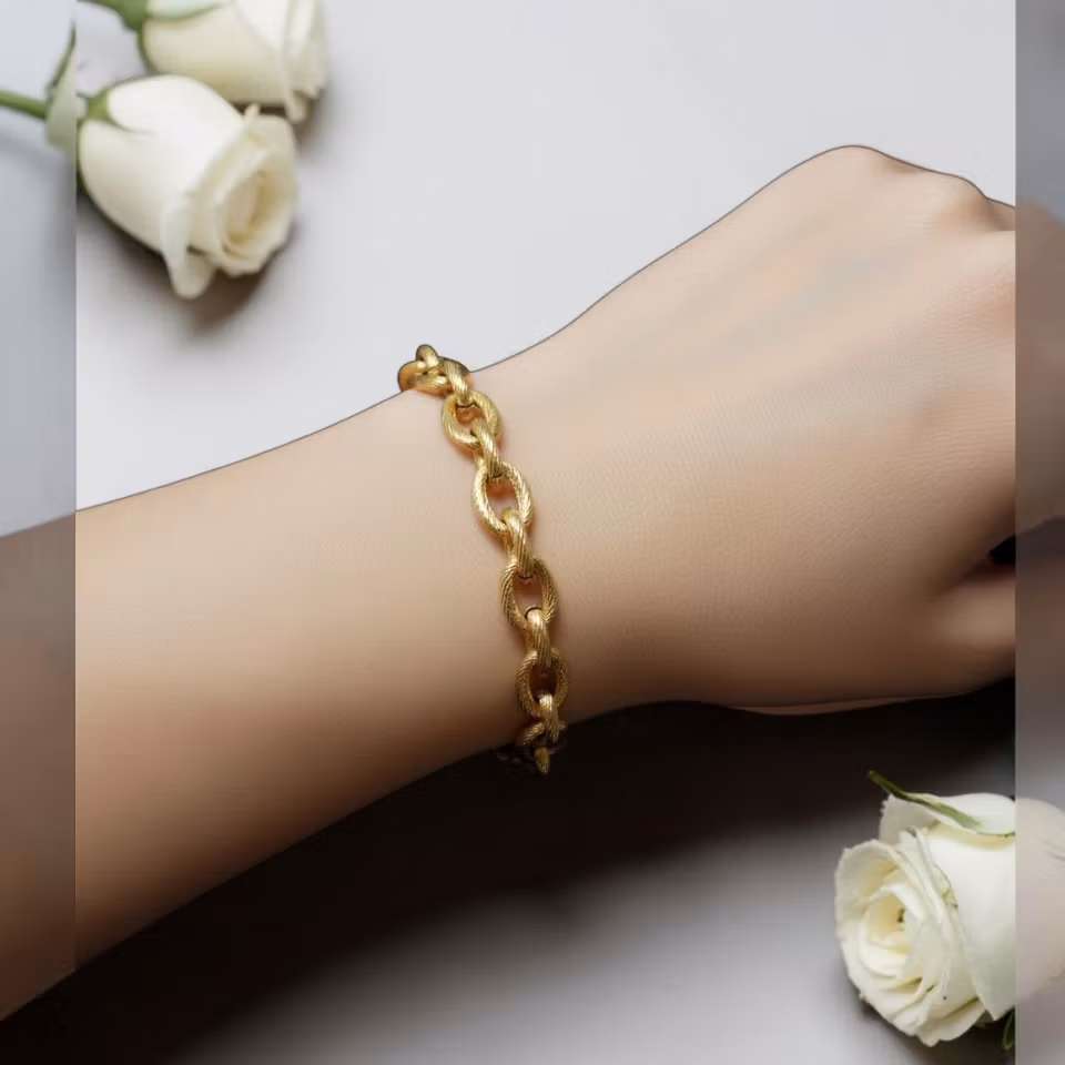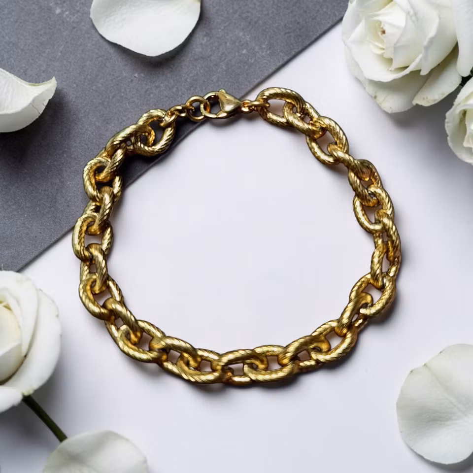 Den är av kirurgiskt stål, med18 karats pvd plätering, 7mm bred.
