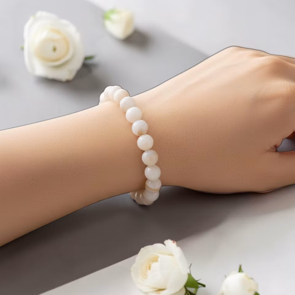 Vackert elastiskt armband i pärlemor. Skicka meddelande I kassan om vilken storlek som önskas.