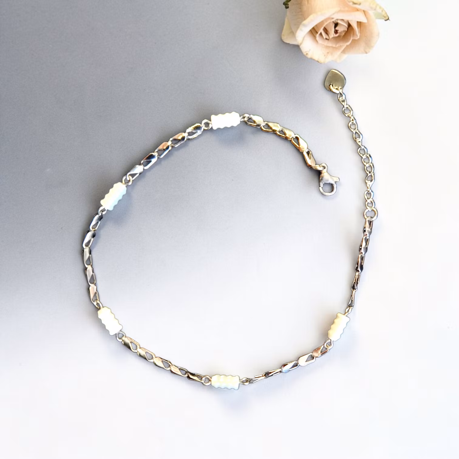 Gjord i kirurgiskt stål som gör att den kan hänga ned på sol och bad utan att färga av sej eller tappa färg.