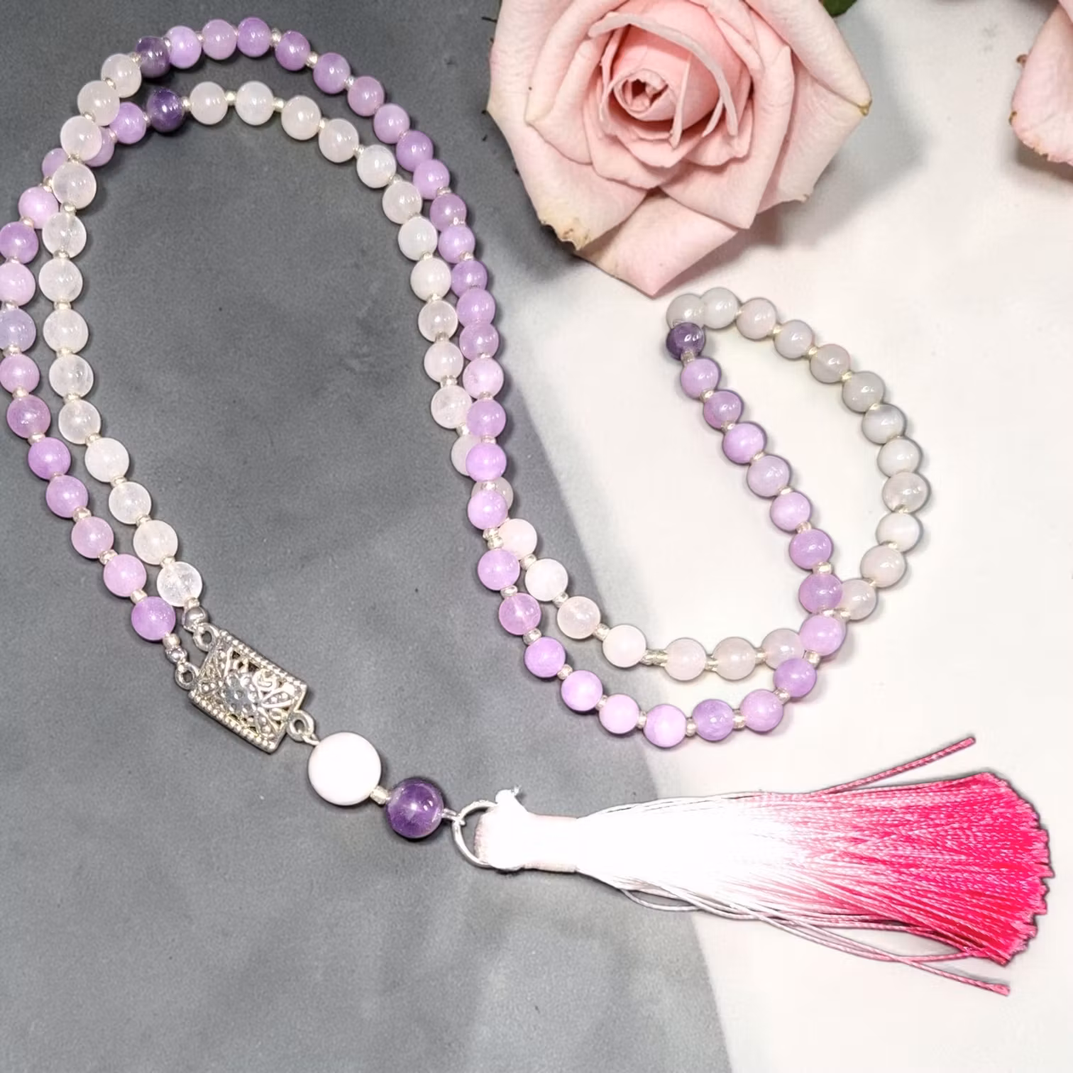 Halsbandet är 80 cm och gjord med ametister och rosenkvart, stenarna är ca 6mm.